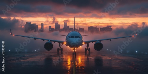 A sleek airplane positioned on a runway with a city skyline and a warm sunset in the background. A dynamic representation of travel and modern aviation