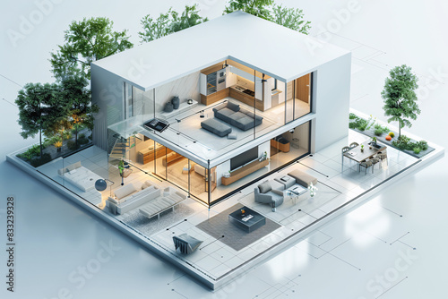 A sleek and futuristic interior of an AI-augmented reality smart home showcases various modern smart home components seamlessly integrated into the minimalist decor. The isometric perspective