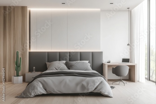 A sleek and minimalist bedroom design with neutral tones and natural lighting.