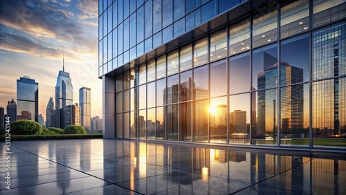 A sleek and modern building with a large glass window at the front, reflecting the cityscape beyond , architectural detail, glass window