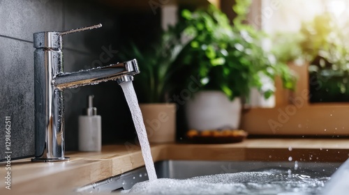 A sleek and modern kitchen faucet pouring water into a stainless steel sink, surrounded by plants and a warm, inviting atmosphere filled with natural light.