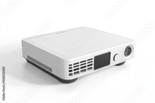 A sleek and modern white projector design. Perfect for home theaters or presentations. Compact size makes it easy to transport. Enjoy high-quality image projections. Generative AI