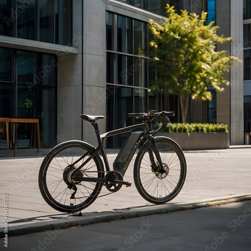 A sleek black electric bike parked on a modern city sidewalk with glass buildings and greenery in the background.