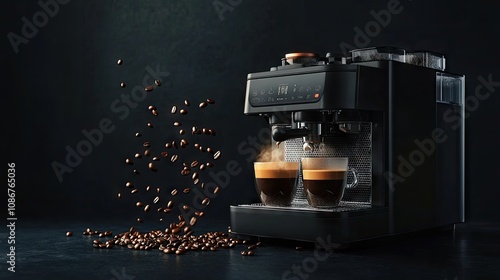 A sleek black espresso machine pouring rich coffee into two cups, surrounded by scattered coffee beans.