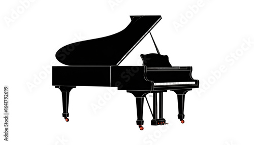 A sleek, black grand piano, elegantly depicted in silhouette, rests on a white background.