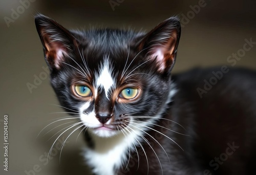 A sleek black kitten with striking white markings, animal shelter, small cat