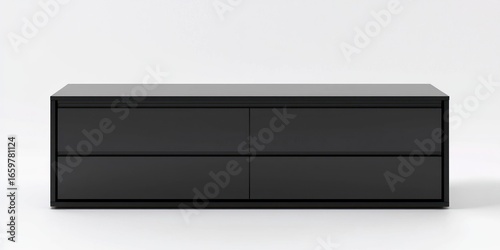 A sleek, black media console sits on a white surface. The console features a flat top and a rectangular body with four drawers. The drawers have black handles.