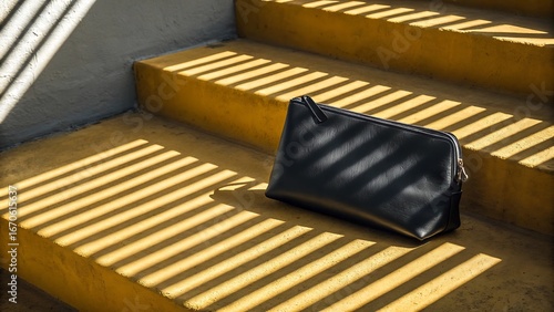 A sleek black pouch sits on yellow stairs, illuminated by striped shadows, creating an artistic composition