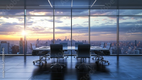 A sleek corporate office boardroom with modern furniture and panoramic city views through floor-to-ceiling windows, Office scene, Corporate elegance style