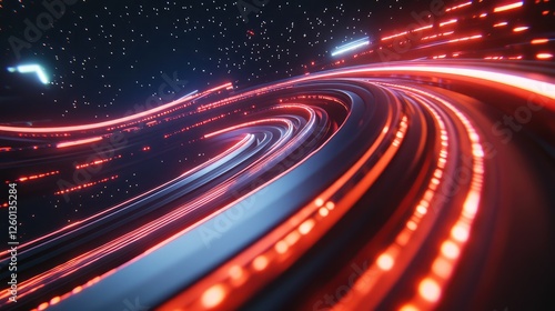 A sleek, curved freeway illuminated by red and white car light trails at night, creating a futuristic energy.