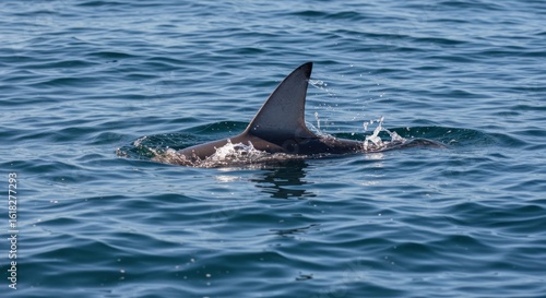 A sleek, dark-colored fin cleaves the surface of a calm ocean, its motion creating small splashes around its base as it moves