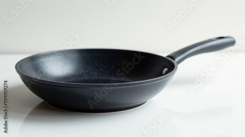 A sleek, dark-grey frying pan rests on a pristine white surface, ready for culinary adventures.