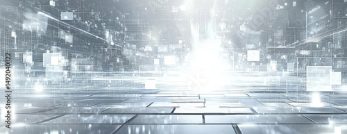 A sleek design combining shades of white and gray with a tech-inspired theme.