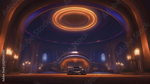 A sleek, futuristic car parked inside a grand, illuminated hall with elegant architecture