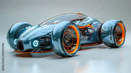A sleek, futuristic car with a blue and silver body, featuring illuminated blue rims, showcased in a modern setting