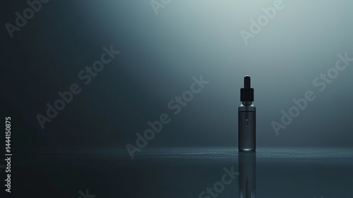 A sleek glass bottle with a dropper, illuminated in soft dramatic lighting.
