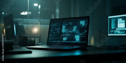 A sleek, glowing laptop sits on a desk in a shadowy room. The blue light from the screen and keyboard illuminates the digital grid, highlighting the computer's advanced technology.
