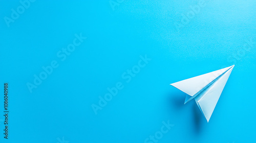 A sleek, handmade paper airplane rests on a bright blue background under natural light, symbolizing creativity and childhood playfulness
