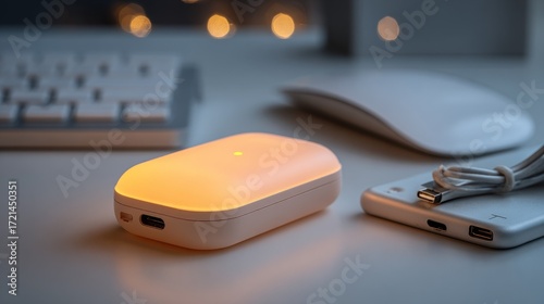 A sleek illuminated portable charger sits atop a desk, surrounded by various computer accessories including a keyboard, mouse, and cables, highlighting a modern workspace setup perfect for charging