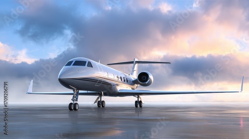 A sleek jet airplane stands on a runway, reflecting the colors of a vibrant sunset with dramatic clouds in the background.