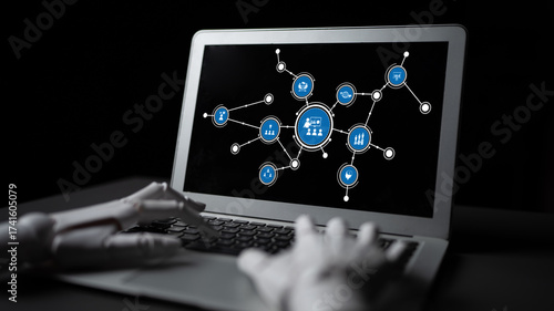 A sleek laptop displaying a digital interface with interconnected nodes and icons, representing the intersection of technology and innovation in modern society. Tessel