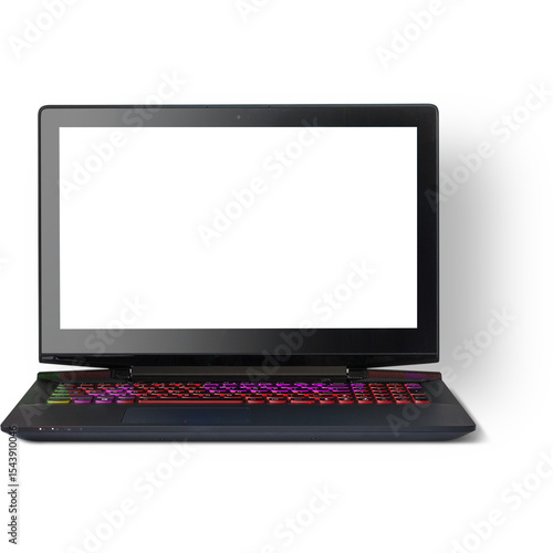A sleek laptop with a blank screen, designed for gaming or creative tasks, featuring a colorful backlit keyboard.