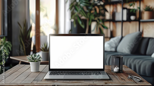 A sleek laptop with a blank screen sits open on a wooden table in a modern living room setting, ready for your content. A small potted plant, a candle holder, and glasses add a touch of warmth to the