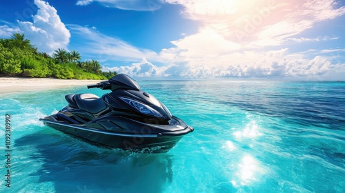 A sleek luxury jet ski floating on crystal-clear turquoise digital