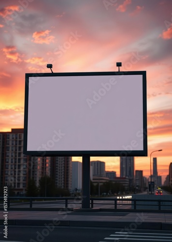 A sleek minimalist billboard mockup bathed in the warm hues of a breathtaking cityscape sunset offers a blank canvas for your advertising masterpiece Ideal for showcasing real estate marketing campaig