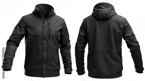 A sleek, modern black hooded jacket is displayed in a front and back studio shot perspective.