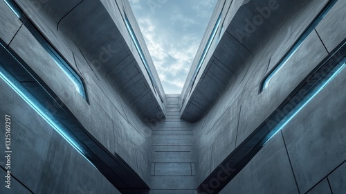 A sleek, modern building with walls of ash gray concrete, shaped symmetrically with abstract designs