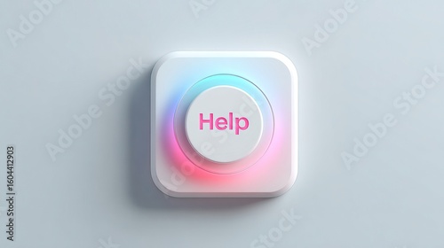 A sleek, modern help button with a glowing pink and blue gradient light, symbolizing assistance, support, and user interaction in a digital context.