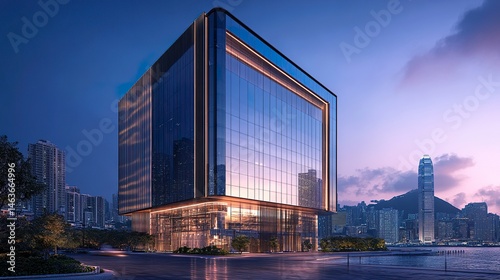 A sleek modern office building with a reflective glass facade, set against the vibrant backdrop of Hong Kong's iconic skyline, showcasing sharp architectural lines
