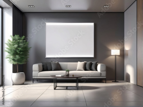 A sleek, modern office waiting area features a blank advertising billboard, bathed in soft, ambient lighting.