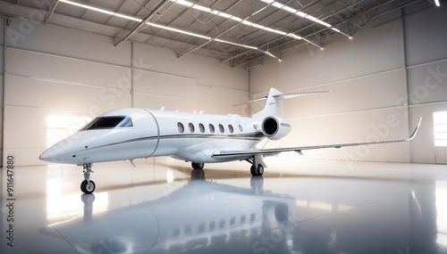 A sleek, modern private jet with a pristine white exterior sits alone in the center of a spacious hangar