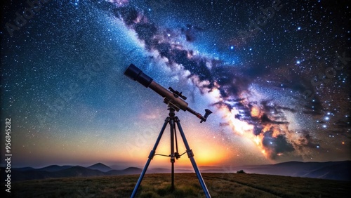 A sleek, modern telescope stands alone under a star-filled night sky, its metal body and tripod gleaming with a subtle, softbox-lit silhouette.