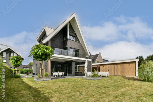 A sleek, modern triangular house featuring large windows, a spacious garden, and a stylish outdoor area for relaxation. The architecture highlights contemporary design trends.