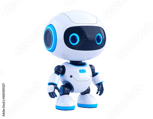 A sleek, modern white and blue robot with bright blue eyes embodies advanced technology and digital assistance.