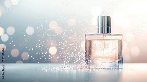 A sleek perfume bottle emits a shimmering spray, set against a soft, blurred background of sparkling lights.