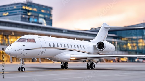 A sleek private jet parked at an airport, showcasing luxury design and modern architecture amid a vibrant sunset backdrop.