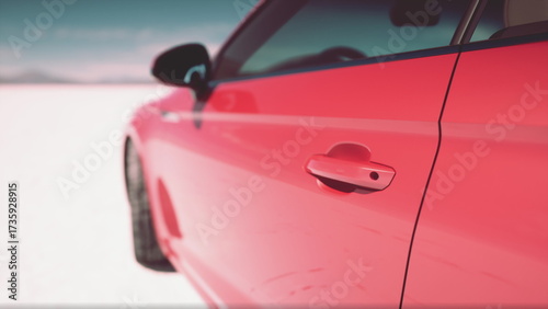 A sleek red car stands out against the pristine white snow, showcasing its modern design. The bright colors contrast beautifully with the serene winter scenery, inviting exploration.