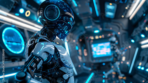 A sleek robot examines glowing control panels in a dimly lit, futuristic spaceship environment