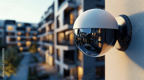A sleek security camera reflects vibrant building lights against twilight, symbolizing modern surveillance technology in urban settings.