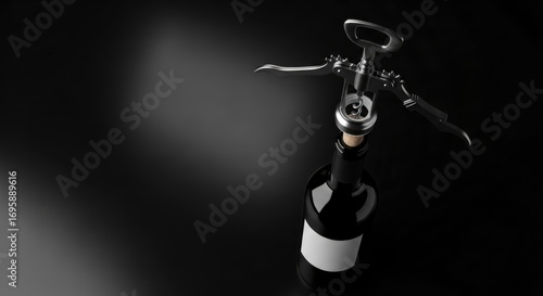 A sleek, silver corkscrew engaged in opening a dark wine bottle, set against a dramatic, minimalist black background. Perfect for luxury beverage concepts.