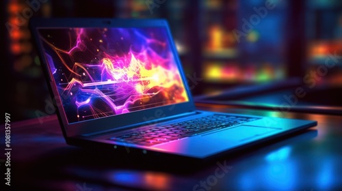 A sleek silver laptop with a vibrant abstract design on the screen, set against a colorful, blurred background.