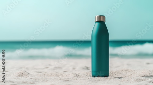 A sleek, teal water bottle stands on sandy beach, with gentle waves and a serene ocean backdrop, evoking a sense of tranquility and hydration.