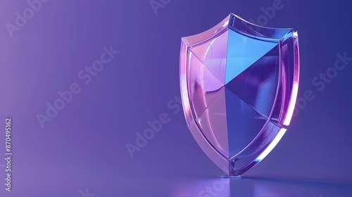A sleek, transparent glass shield emblem on a gradient purple background, symbolizing protection and security in modern design.