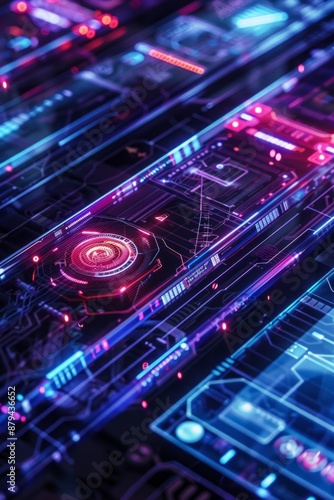 A sleek, transparent interface with floating holographic screens and controls, rendered in shades of blue and purple, with glowing accents