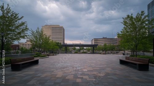A sleek urban plaza with a skyline under cloudy skies. Featuring elegance and quiet