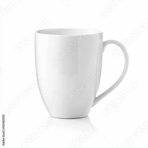 A sleek white ceramic mug, perfect for your morning coffee or tea, featuring a smooth glossy finish for a modern touch.